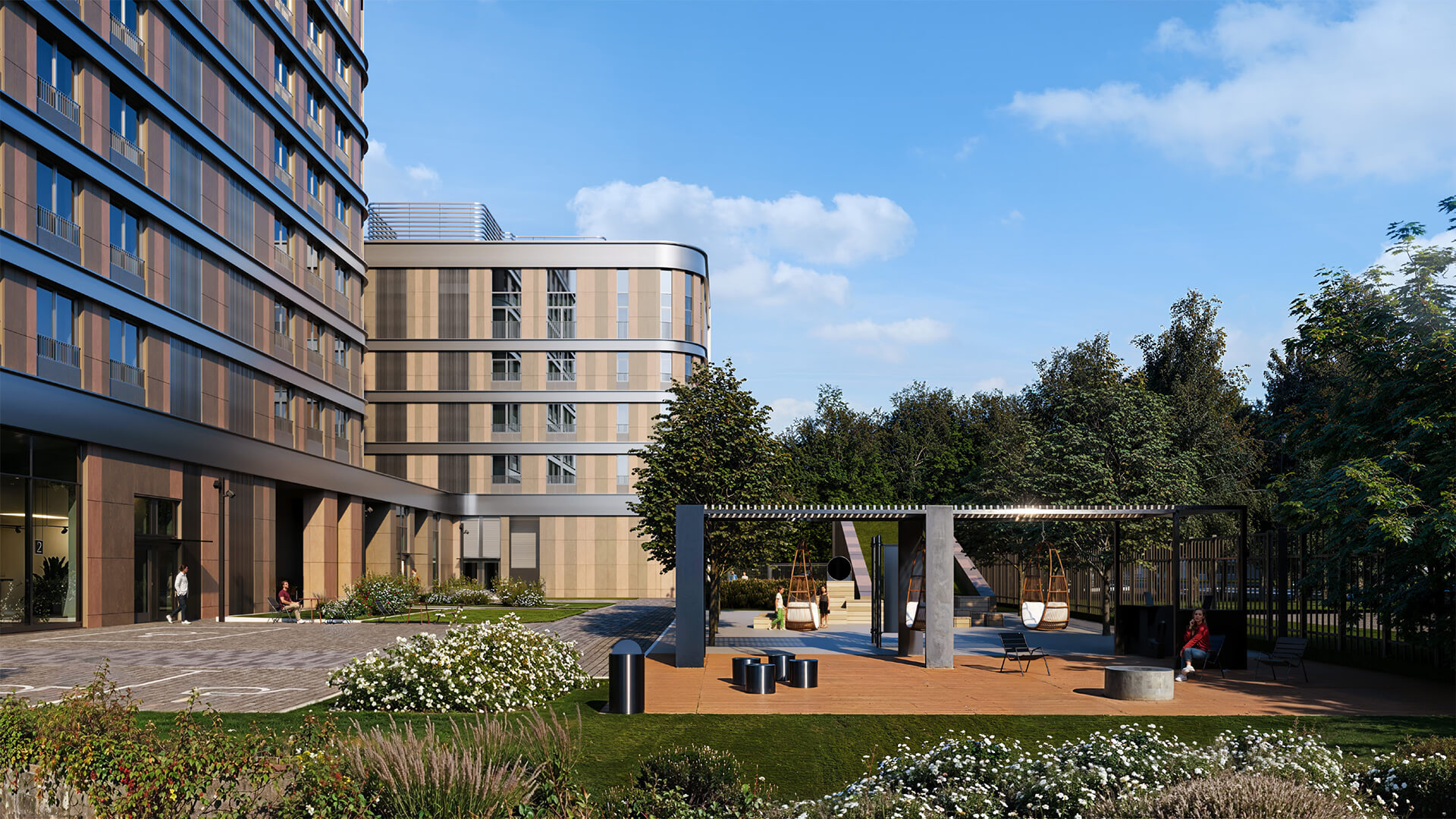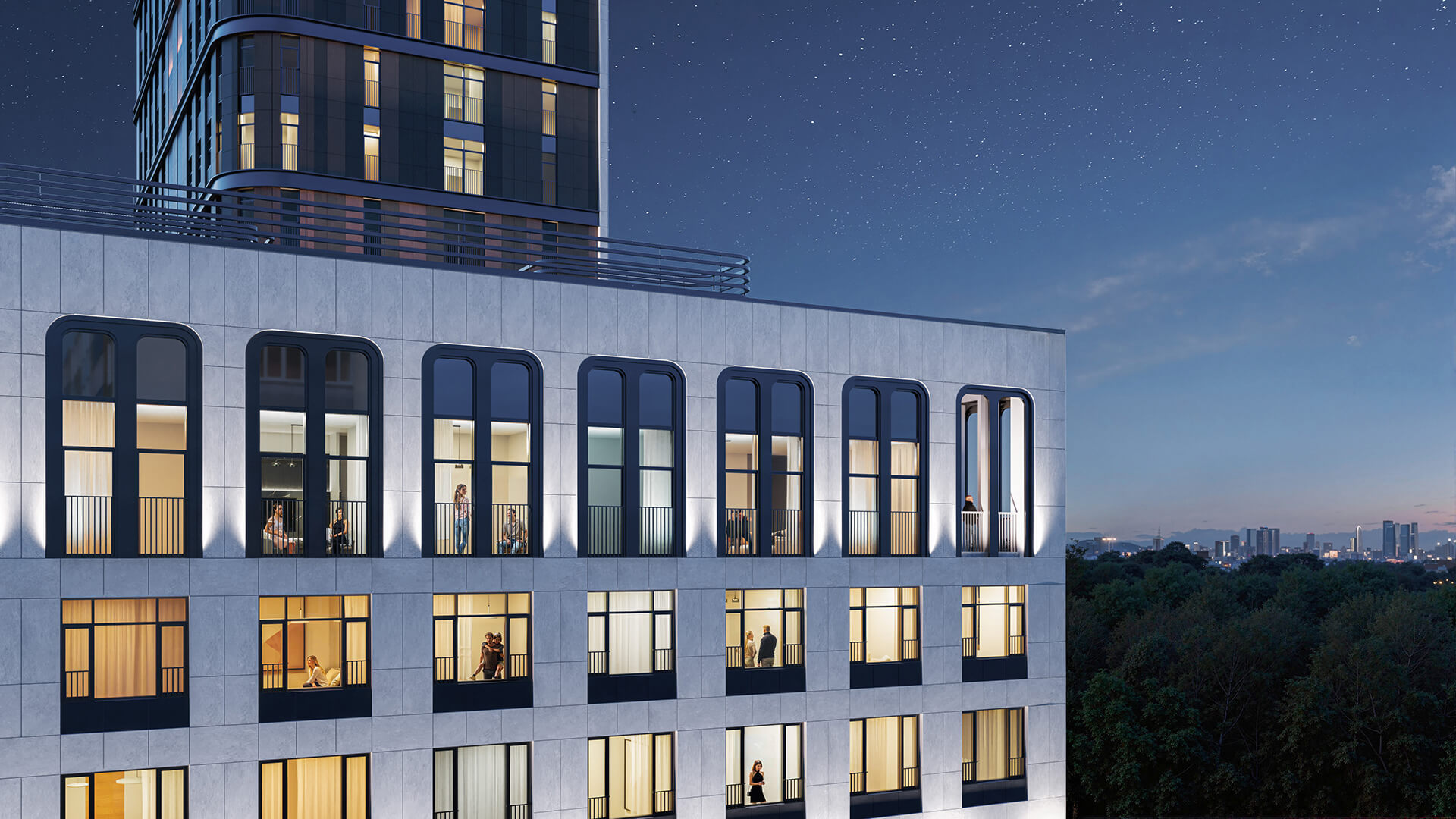 Дворовые фасады оформлены в тёплой гамме коричневых оттенков, а цветовой градиент — от светлого бежевого к насыщенному шоколадному — напоминает небо на закате. Эта архитектурная идея находит отражение и в оформлении внутренних пространств, создавая ощущение завершённости образа. Для дополнительного акцента используется архитектурная подсветка фасадов, усиливающая эффект уюта и приватности в тёмное время суток.