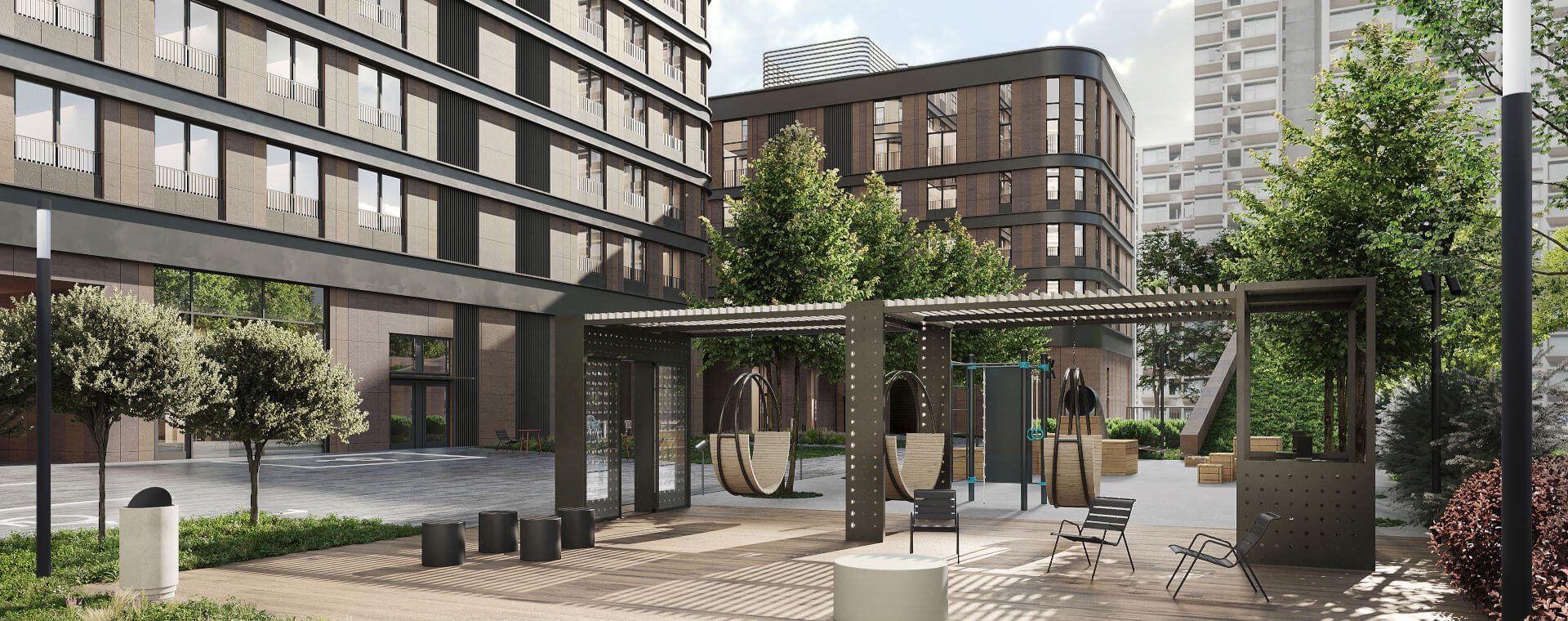 Особое внимание уделено безопасности и функциональности: в детских и спортивных зонах используются ударопоглощающие покрытия, а архитектура благоустройства поддерживает концепцию камерного и приватного проживания. Здесь можно работать в коворкинг-зоне на свежем воздухе, устраивать семейные пикники или заниматься утренней йогой в специально отведённой зоне.