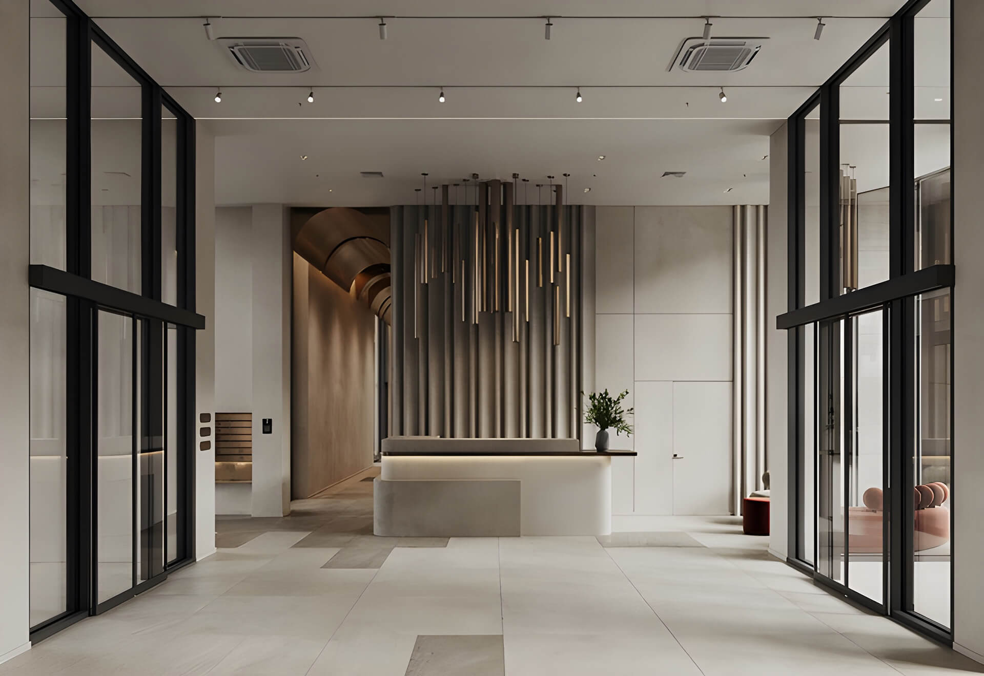 Функциональные зоны включают в себя зону ожидания с мягкой мебелью, ресепшн с круглосуточным обслуживанием, переговорную комнату и систему контроля доступа. Лобби служит не только пространством для встречи гостей, но и местом ежедневного комфорта для жителей. Подвесные светильники, изящные формы мебели и благородные материалы подчёркивают высокое качество исполнения и принадлежность к сегменту премиальной недвижимости.